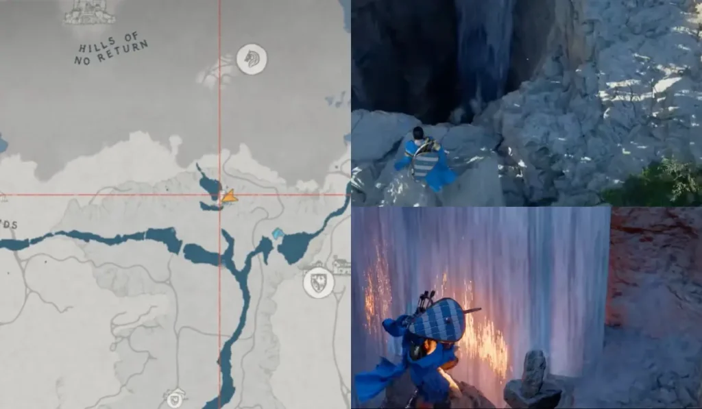 Arriviamo all’orlo di un precipizio dominato da un paio di cascate e dovremo lanciarci nelle profondità della gola. Introduciamoci dietro alla cascata e in fondo al sentiero troviamo il forziere che custodisce gli Scorchflame Plate Gloves.