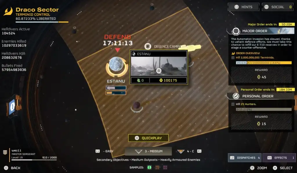 Una delle prime cose che noterete appena arruolati negli Helldivers saranno gli ‘Ordini Maggiori’ e gli ‘Ordini Personali’, che potete controllare in ogni momento sul lato destro del vostro schermo. Si tratta di direttive che gli sviluppatori impartiscono alla community di Helldivers 2, in modo da difendere la Super Terra e vincere la guerra.