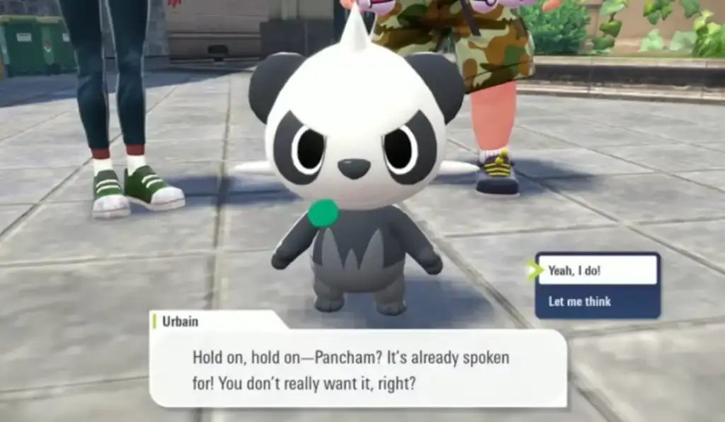 Dietro ai tre Pokémon già citati possiamo scorgere un Pancham fra una coppia di allenatori e, se ci avviciniamo, ci accorgiamo di poter iniziare la nostra avventura proprio con lui. Si tratta di un Pokémon di tipo Lotta introdotto con la Sesta Generazione e ha le sembianze di un adorabile cucciolo di panda.